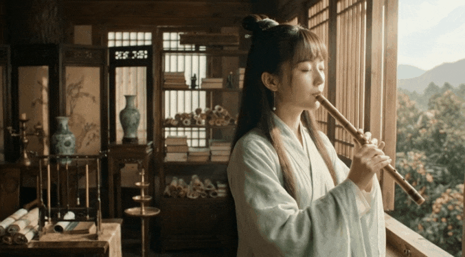 裘芷仙正坐在窗邊對著繽紛的桂花吹奏,身後傳來朱文的聲音:“芷仙妹子這曲子真好聽。”