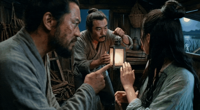 船上除了一名老叟劃櫓掌舵,還有兩個年輕水手,劉姓漢子招呼他們舉帆劃槳,開船離開了蘆葦蕩。