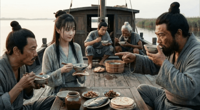船上夥食很一般,就是乾餅子配魚湯,幾個人圍著木頭圓桌一起吃。