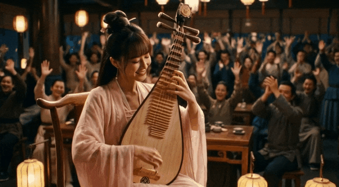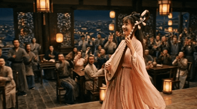 裘芷仙早就習慣了這種場麵,表現從容淡定,她一襲淡粉襦裙,梳著垂髫髮髻,婷婷娜娜的捧著琵琶來到戲台上。